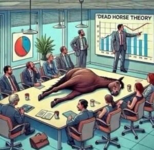 A “Teoria do Cavalo Morto” é uma metáfora satírica que reflete como algumas pessoas, instituições ou nações enfrentam problemas evidentes que são impossíveis de resolver, mas em vez de aceitar a realidade, se agarram a justificá-los.